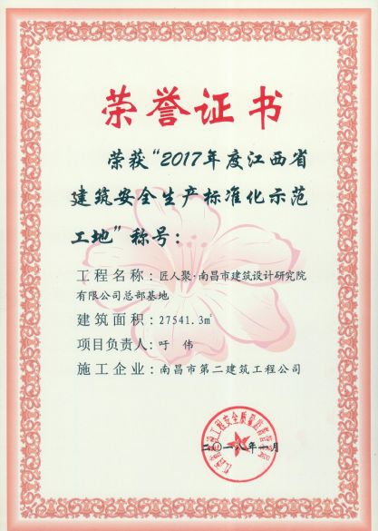 公司承建的郭家莊地塊棚戶區(qū)改造項目(安置房)工程、匠人聚.南昌市建筑設(shè)計研究院有限公司總部基地榮獲2017年度江西省建筑安全生產(chǎn)標準化示范工地稱號。